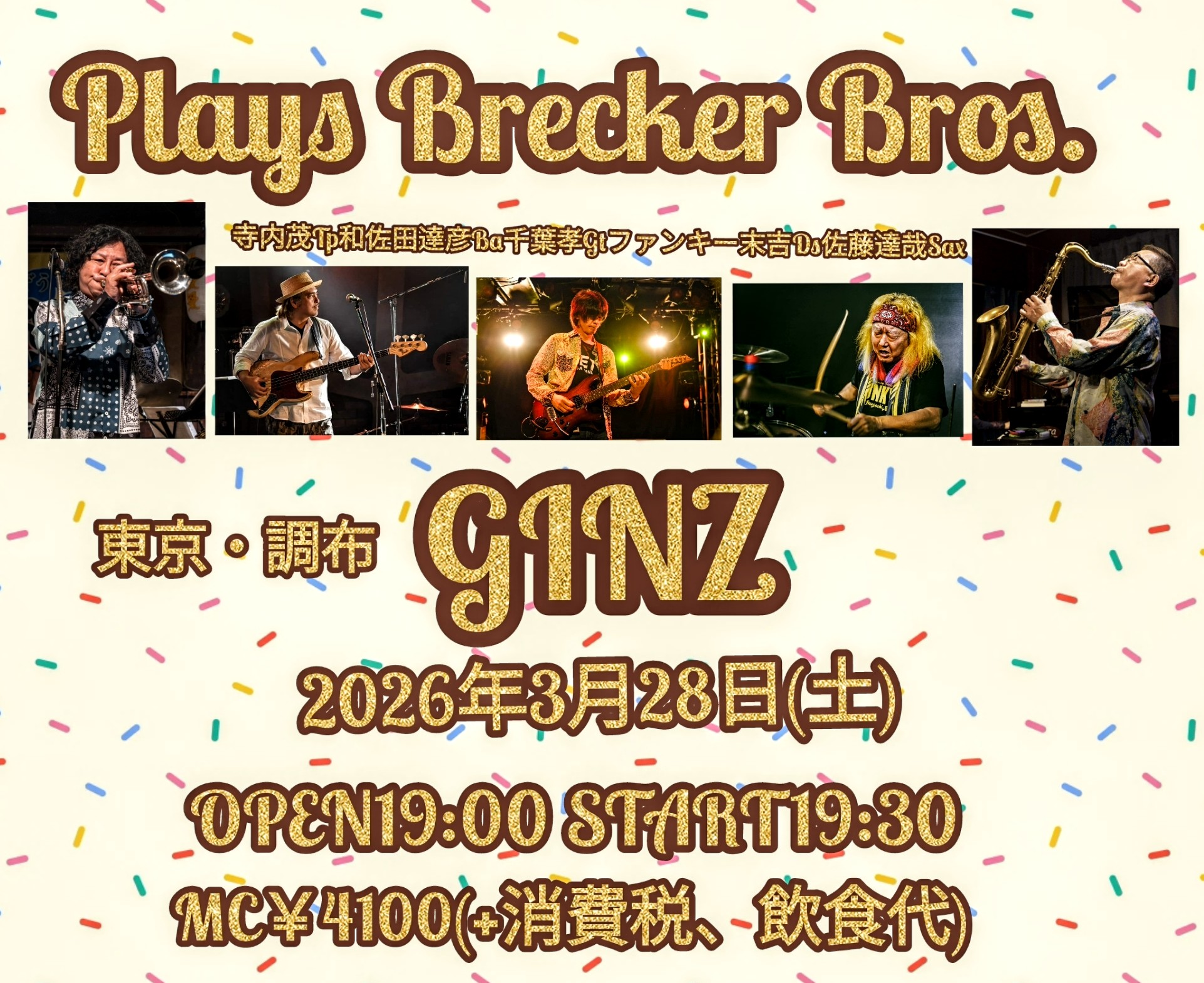 ファンキー末吉(ds)Plays Brecker Bros. (ts)佐藤 達哉Sax(tp)寺内 茂Tp(g)千葉“団長”孝(b)和佐田 達彦 |