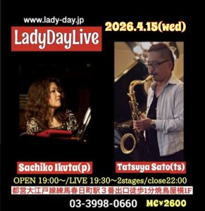 佐藤達哉(ts, ss)生田さち子(p)Duo 19:00開場19:30開演 |