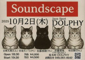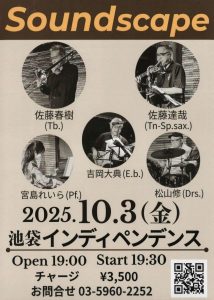 佐藤春樹(tb)サウンドスケープ<佐藤達哉(ts,ss)宮島れいら(p)吉岡大典(b)松山修(ds)> 19:30演奏開始 |