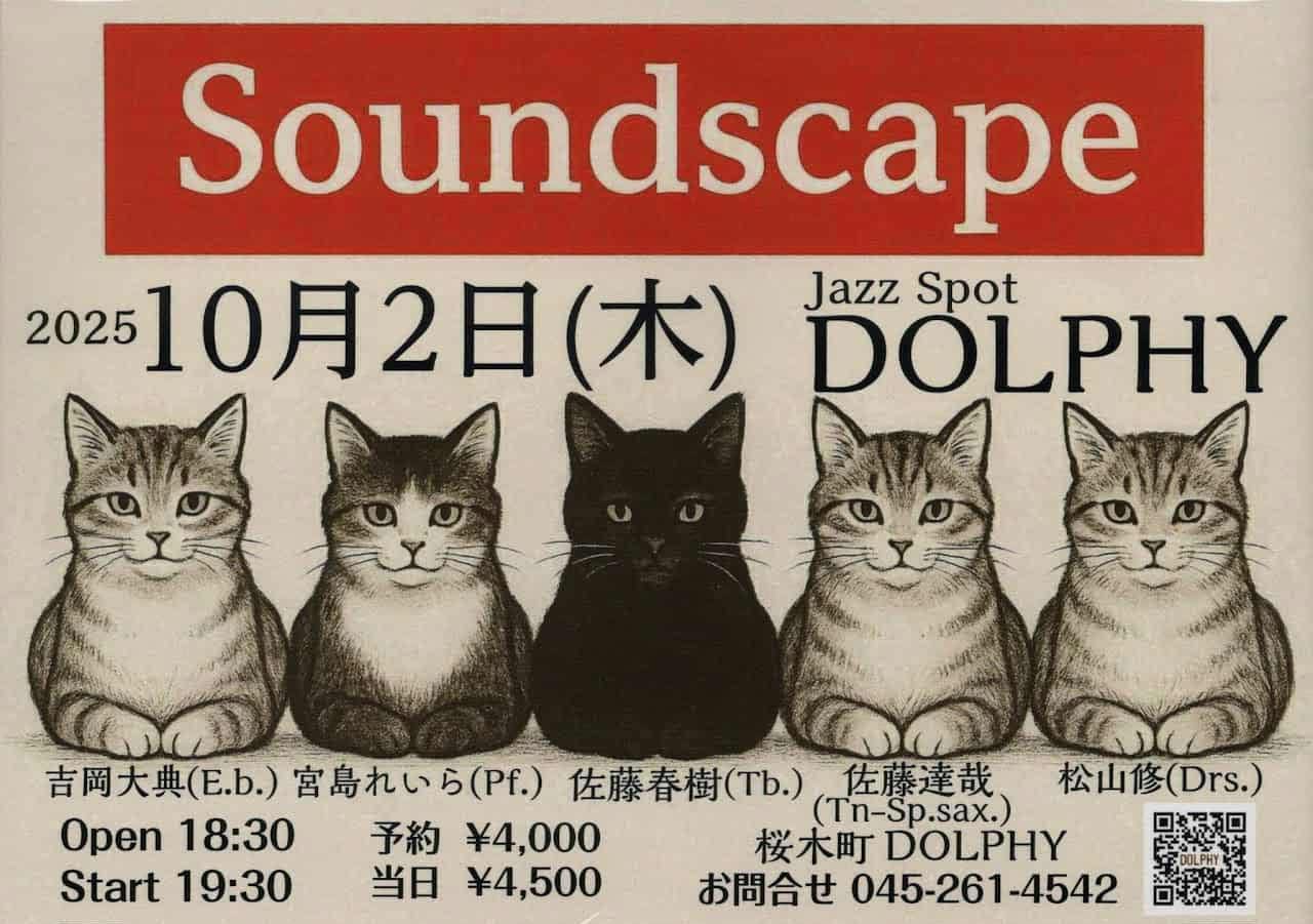 佐藤春樹(tb)サウンドスケープ<佐藤達哉(ts,ss)宮島れいら(p)吉岡大典(b)松山修(ds)> 19:30〜演奏開始 |