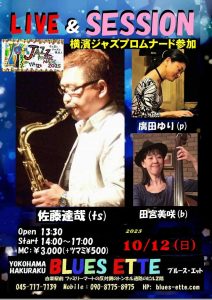 田宮美咲(b)ライブ&セッション<佐藤達哉(ts,ss)廣田ゆり(p)> 横浜ジャズプロムナード参加 14:00開演 13:30開場 |
