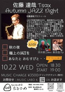Autumn Jazz Night 佐藤達哉(ts, ss) with 桑原晶子(p)岡本勝之(b) |