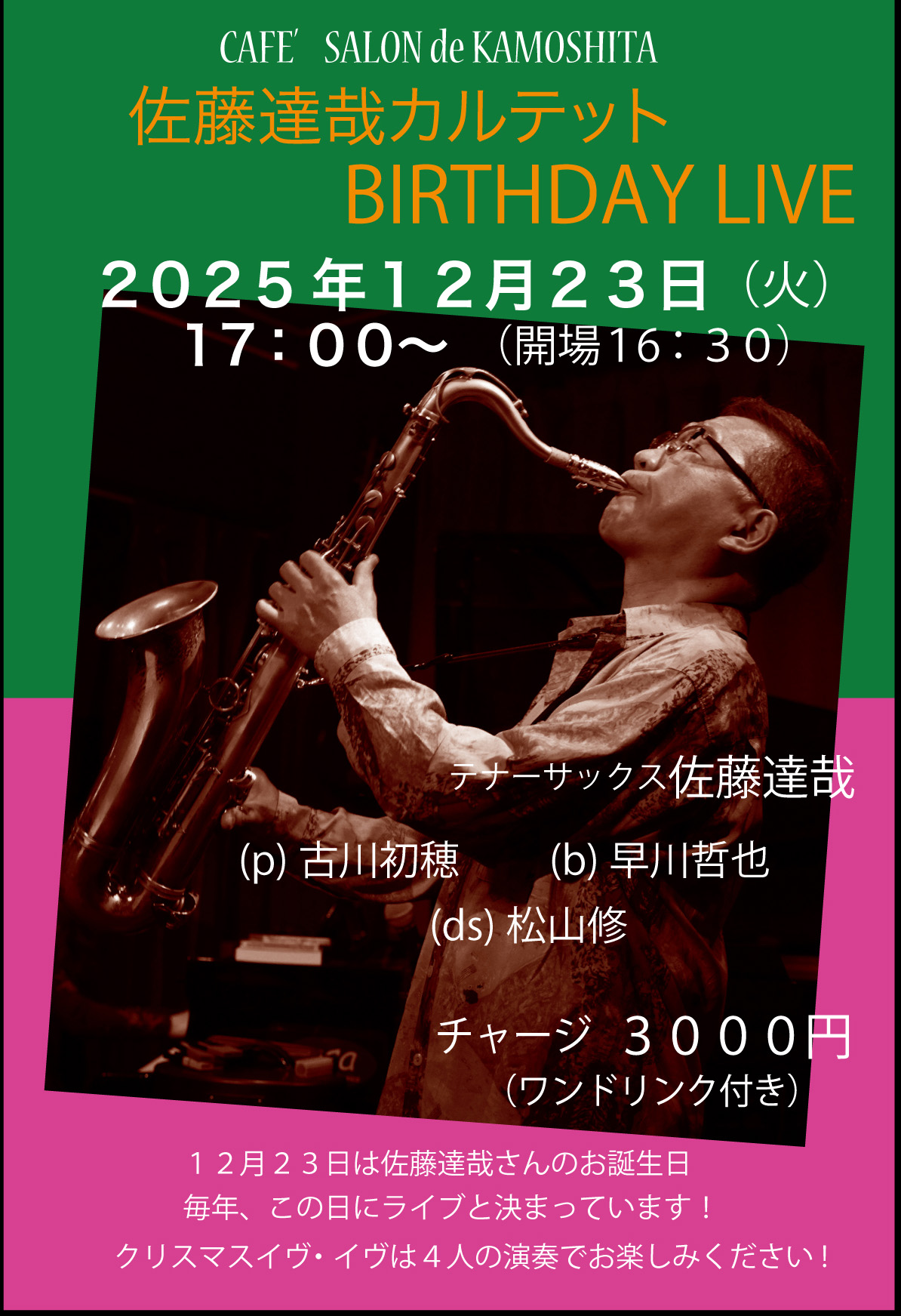 分倍河原・ワインショップ鴨下: 佐藤達哉(ts, ss)バースデイ・ライヴ 古川初穂(p)早川哲也(b)松山修(ds) 17:00開始 |