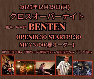佐藤達哉(ts, ss)東川幸綱(tp)小田千津子(p)藤村竜也(b)中村雄二郎(ds) 1st/19:30~ 2nd/21:00~ |