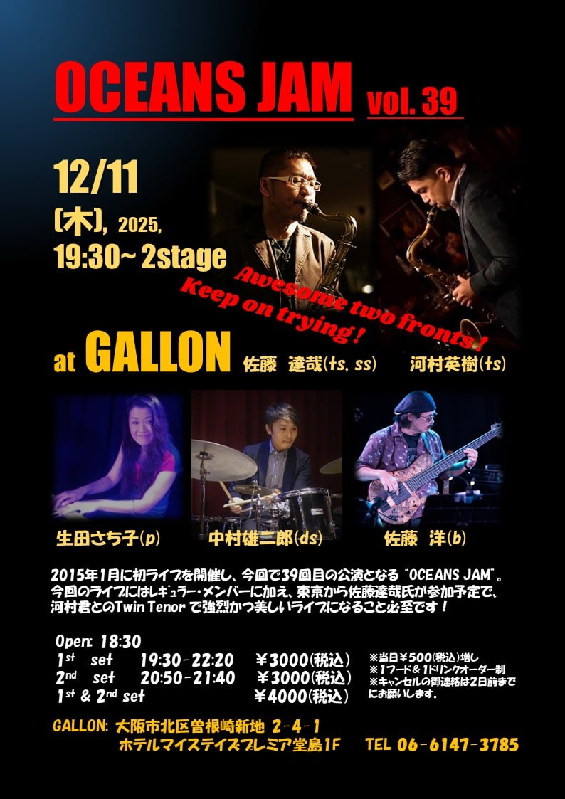 佐藤洋(b)G<佐藤達哉(ts, ss)河村英樹(ts)生田さち子(p)中村雄二郎(ds)> Oceans Jam vol.39 |