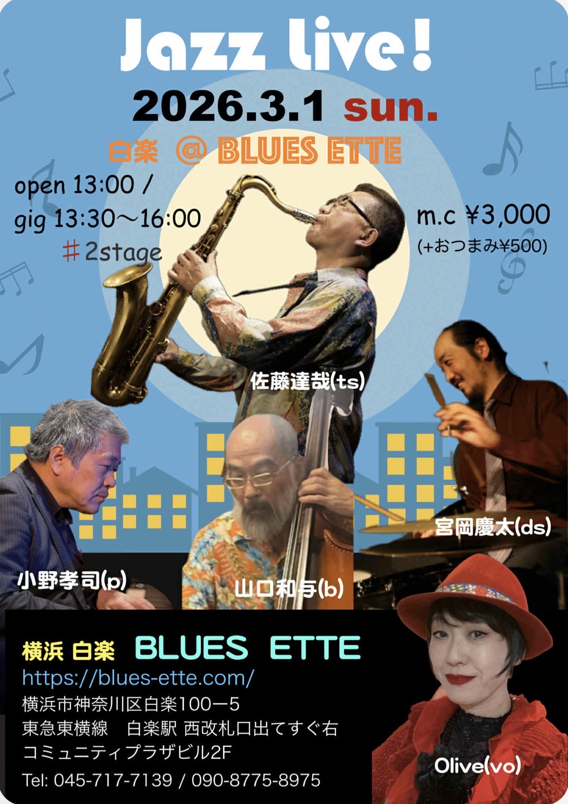 Minako Olive Ono Live‼️ Olive(vo)佐藤達哉(ts, ss)小野孝司(p)山口和与(b)宮岡慶太(ds) open 13:00 start13:30 |